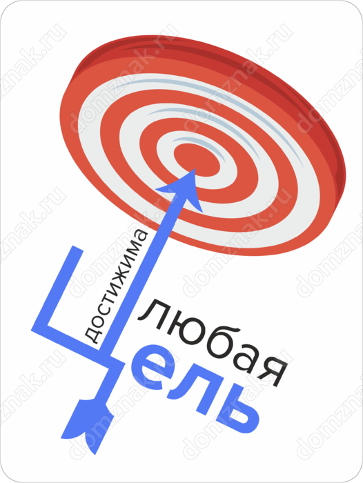 Табличка «Любая цель достижима» изготовлена из пластика ПВХ, толщиной 4 мм. Изображение наносится по технологии УФ-печати. Табличка предназначена для использования как в помещении, так и на улице.