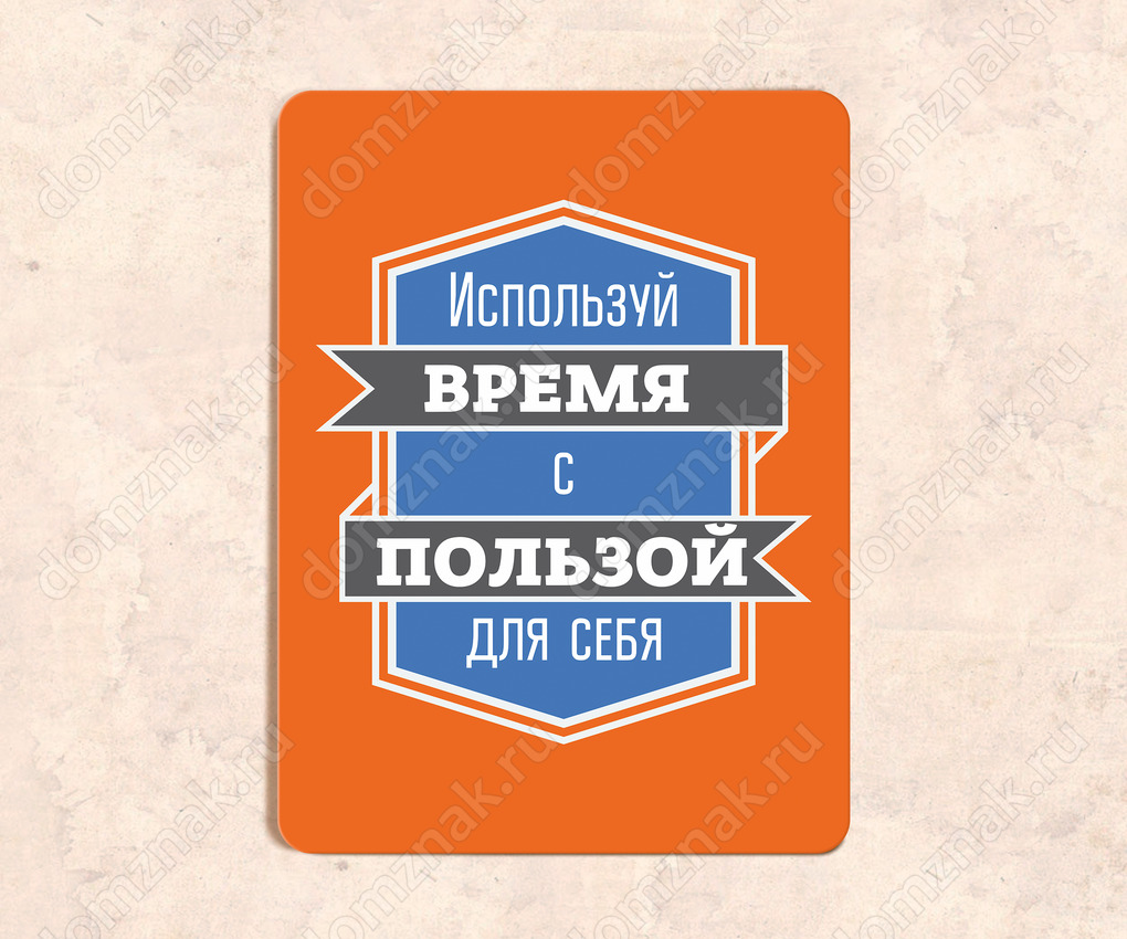 Табличка «Используй время с пользой для себя» изготовлена из пластика ПВХ, толщиной 4 мм. Изображение наносится по технологии УФ-печати. Табличка предназначена для использования как в помещении, так и на улице.